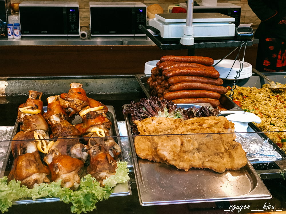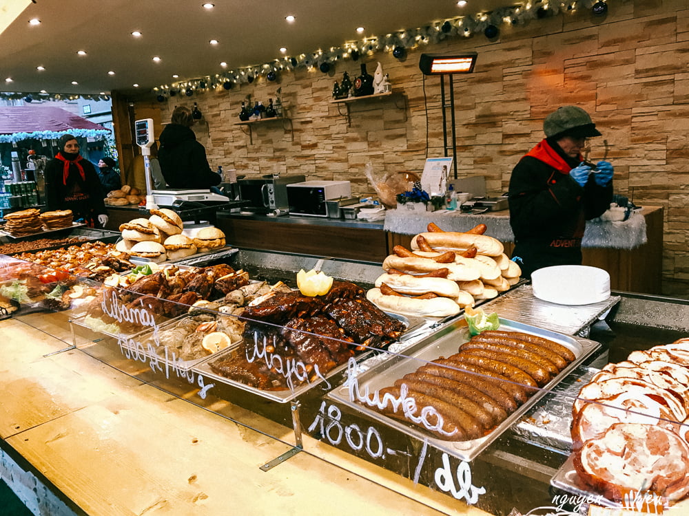 Các món nên thử: Lángos – 1 loại bánh rán kèm với phô-mai và kem tươi. Bejgli – bánh bông lan “khúc gỗ” nhân hạt anh túc hoặc óc chó và nho khô. Gulyás – món súp hầm thịt và rau củ đặc trưng của người Hungary. Kürtőskalács – món bánh tương tự Trdelník ở Prague. Rượu vang nóng,…
