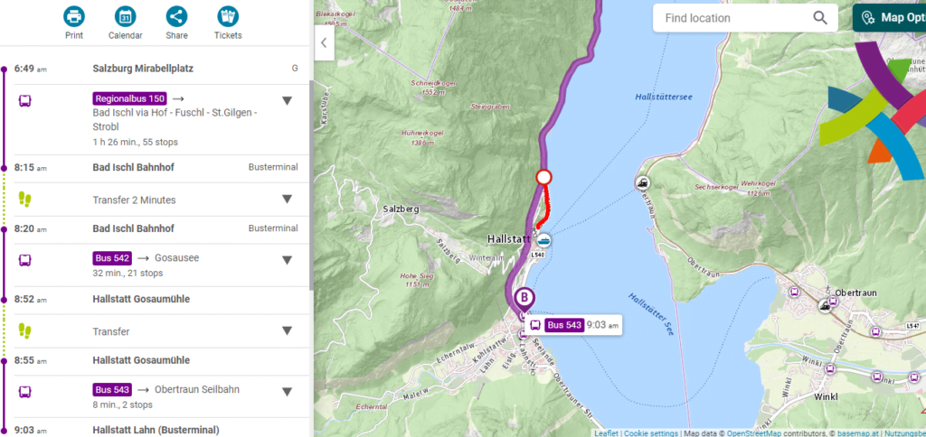 - Chặng 1: Xuất phát từ bến Salzburg Mirabellplatz đi bus số 150 tới bến Bad Ischl Bahnhof. Thời gian: khoảng 1h15’, giá vé: 11,30€/chiều.