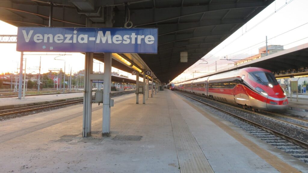 Tại Ý, hệ thống đường sắt cao tốc bao phủ gần như tất cả các thành phố nên việc đi lại bằng tàu hoả rất thuận tiện. Để tới Venice thì bạn có thể đi tàu tới ga Mestre (Venezia Mestre) – nếu khách sạn trên đất liền, hoặc ga Venezia Santa Lucia – nếu nghỉ trên đảo chính. Vé có thể mua trực tiếp hoặc online qua trang trenitalia (công ty đường sắt của Ý).
